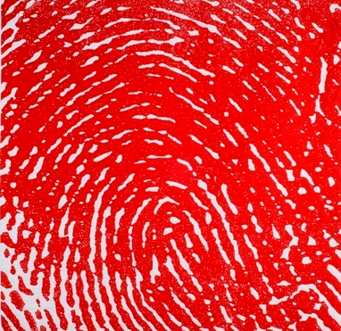 Fingerprint #45: Red Print 58 1/2” x 58 12” Cotton blend whole cloth reverse applique, machine stitched and quilted. (Click image for larger view) Red Print Detail |