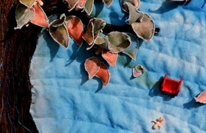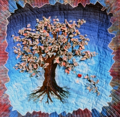 When the Bough Breaks 53” x 53” Cotton canvas hand painted with textile dyes, direct applique machine stitched and embellished, hand stitching and found objects. (Click image for larger view) When the Bough Breaks Detail |