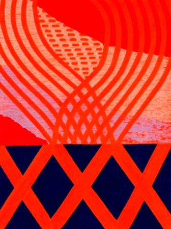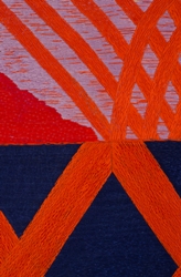 Convergence 33 1/2" x 45" One layer of cotton canvas, two layers of navy blue cotton. Stitched and quilted by hand with random running stitches using #5 perle cotton. Stitches completely cover all of the fabric. (Click image for larger view) Convergence detail |