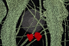 Three Moons 50" x 40" Two layers of black cotton/poly, one layer of cotton. Stitched and quilted by hand with random running stitches and french knots using #5 perle cotton. #3 perle cotton with small running stitches creates the moons. (Click image for larger view) Three Moons detail |